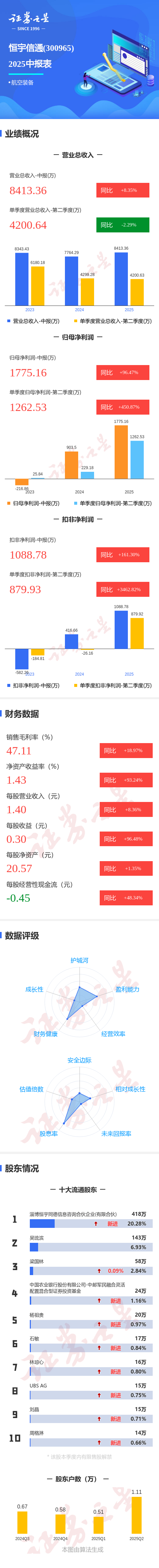 证券之星消息,恒宇信通2025年中报显示,公司主营收入8413.36万元,同比上升8.36%;归母净利润1775.16万元,同比上升96.47%;扣非净利润1088.78万元,同比上升161.31%;其中2025年第二季度,公司单季度主营收入4200.64万元,同比下降2.29%;单季度归母净利润1262.53万元,同比上升450.87%;单季度扣非净利润879.93万元,同比上升3462.83%;负债率14.79%,投资收益658.83万元,财务费用-18.98万元,毛利率47.11%。