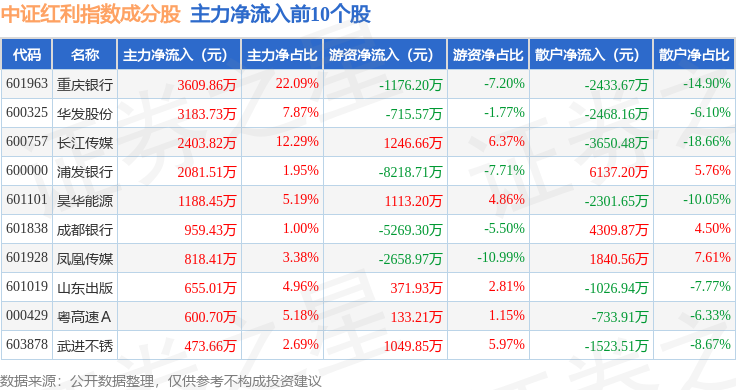 资金流向方面,中证红利(000922)指数成份股当日主力资金净流出合计76.73亿元,游资资金净流入合计26.34亿元,散户资金净流入合计50.39亿元。成份股资金流向详情见下表: