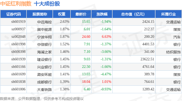 中证红利(000922)指数十大成份股详情如下:
