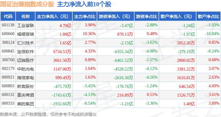 资金流向方面,国证治理(399322)指数成份股当日主力资金净流出合计123.18亿元,游资资金净流入合计35.2亿元,散户资金净流入合计87.98亿元。成份股资金流向详情见下表: