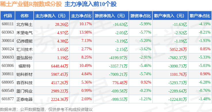 资金流向方面,稀土产业链R(489013)指数成份股当日主力资金净流出合计25.05亿元,游资资金净流出合计4.25亿元,散户资金净流入合计29.3亿元。成份股资金流向详情见下表: