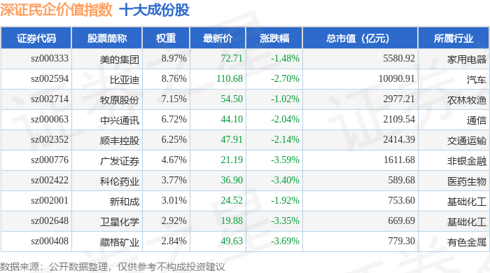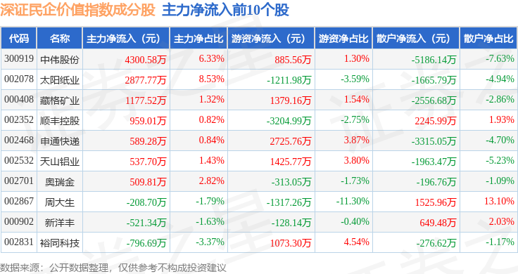 资金流向方面,深证民企价值(970072)指数成份股当日主力资金净流出合计48.14亿元,游资资金净流入合计14.8亿元,散户资金净流入合计33.34亿元。成份股资金流向详情见下表: