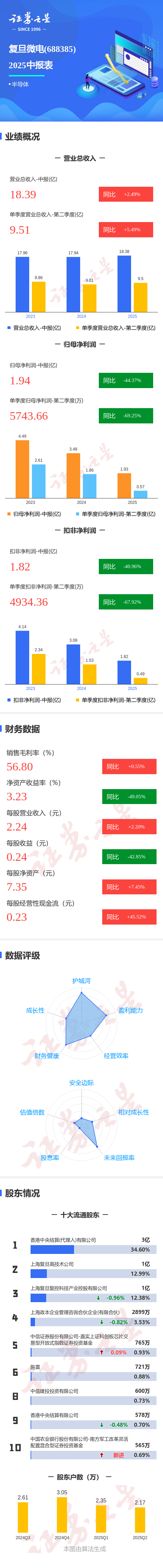 证券之星消息,复旦微电2025年中报显示,公司主营收入18.39亿元,同比上升2.49%;归母净利润1.94亿元,同比下降44.38%;扣非净利润1.82亿元,同比下降40.96%;其中2025年第二季度,公司单季度主营收入9.51亿元,同比上升5.5%;单季度归母净利润5743.66万元,同比下降69.26%;单季度扣非净利润4934.36万元,同比下降67.92%;负债率28.29%,投资收益71.39万元,财务费用1538.05万元,毛利率56.8%。