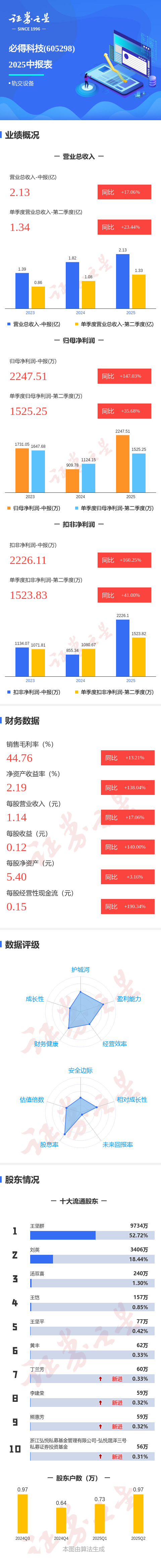 证券之星消息,必得科技2025年中报显示,公司主营收入2.13亿元,同比上升17.06%;归母净利润2247.51万元,同比上升147.04%;扣非净利润2226.11万元,同比上升160.26%;其中2025年第二季度,公司单季度主营收入1.34亿元,同比上升23.44%;单季度归母净利润1525.25万元,同比上升35.68%;单季度扣非净利润1523.83万元,同比上升41.01%;负债率19.06%,投资收益-8.57万元,财务费用-88.1万元,毛利率44.76%。