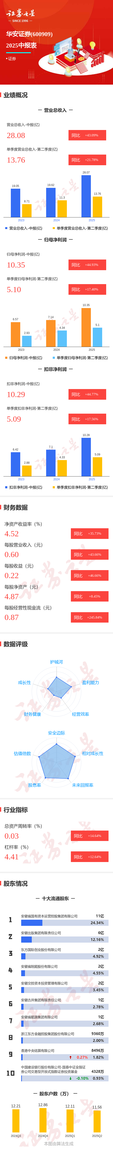 证券之星消息,华安证券2025年中报显示,公司主营收入28.08亿元,同比上升43.09%;归母净利润10.35亿元,同比上升44.94%;扣非净利润10.29亿元,同比上升44.77%;其中2025年第二季度,公司单季度主营收入13.76亿元,同比上升21.79%;单季度归母净利润5.1亿元,同比上升17.41%;单季度扣非净利润5.09亿元,同比上升17.56%;负债率77.3%,投资收益11.58亿元。