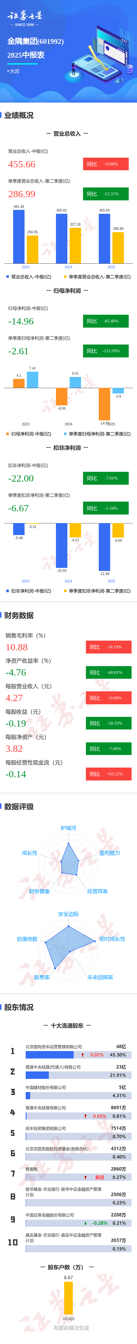 证券之星消息,金隅集团2025年中报显示,公司主营收入455.66亿元,同比上升0.01%;归母净利润-14.96亿元,同比下降85.4%;扣非净利润-22.0亿元,同比下降7.01%;其中2025年第二季度,公司单季度主营收入286.99亿元,同比下降12.31%;单季度归母净利润-2.61亿元,同比下降152.0%;单季度扣非净利润-6.67亿元,同比下降1.34%;负债率66.54%,投资收益2.48亿元,财务费用14.58亿元,毛利率10.88%。