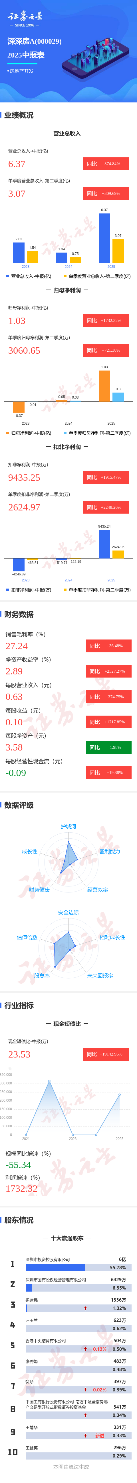 证券之星消息,深深房A2025年中报显示,公司主营收入6.37亿元,同比上升374.85%;归母净利润1.03亿元,同比上升1732.32%;扣非净利润9435.25万元,同比上升1915.47%;其中2025年第二季度,公司单季度主营收入3.07亿元,同比上升309.69%;单季度归母净利润3060.65万元,同比上升721.39%;单季度扣非净利润2624.97万元,同比上升2248.27%;负债率35.22%,投资收益9.97万元,财务费用121.33万元,毛利率27.24%。