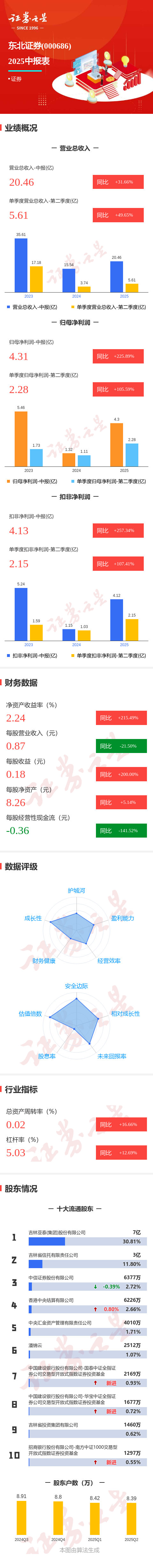 证券之星消息,东北证券2025年中报显示,公司主营收入20.46亿元,同比上升31.66%;归母净利润4.31亿元,同比上升225.9%;扣非净利润4.13亿元,同比上升257.35%;其中2025年第二季度,公司单季度主营收入5.61亿元,同比上升49.65%;单季度归母净利润2.28亿元,同比上升105.59%;单季度扣非净利润2.15亿元,同比上升107.41%;负债率80.12%,投资收益5.66亿元。