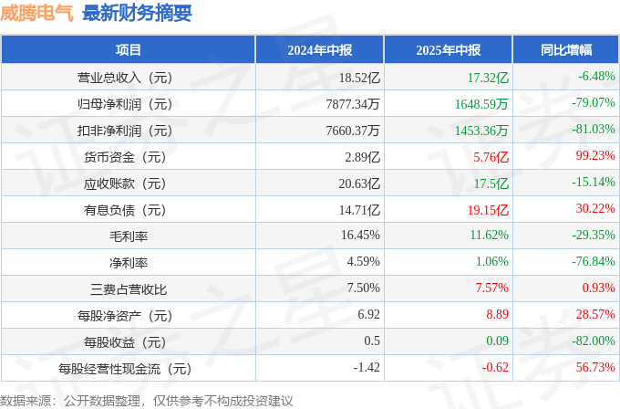 据证券之星公开数据整理,近期威腾电气(688226)发布2025年中报。截至本报告期末,公司营业总收入17.32亿元,同比下降6.48%,归母净利润1648.59万元,同比下降79.07%。按单季度数据看,第二季度营业总收入8.59亿元,同比下降18.8%,第二季度归母净利润319.12万元,同比下降92.66%。本报告期威腾电气公司应收账款体量较大,当期应收账款占最新年报归母净利润比达1844.92%。