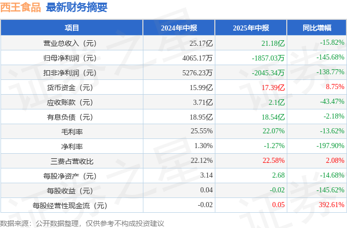 据证券之星公开数据整理,近期西王食品(000639)发布2025年中报。根据财报显示,西王食品净利润同比下降145.68%。截至本报告期末,公司营业总收入21.18亿元,同比下降15.82%,归母净利润-1857.03万元,同比下降145.68%。按单季度数据看,第二季度营业总收入10.79亿元,同比下降11.45%,第二季度归母净利润-2608.64万元,同比下降155.61%。