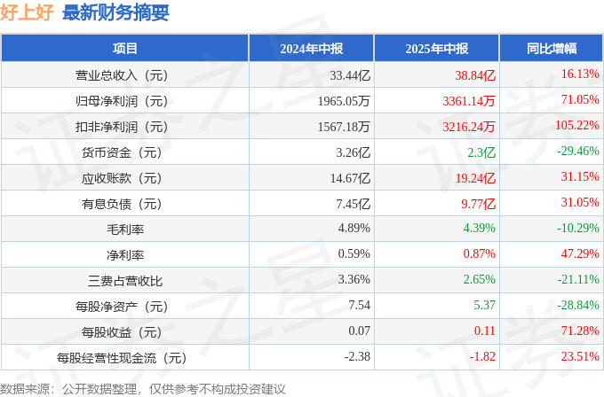 据证券之星公开数据整理,近期好上好(001298)发布2025年中报。截至本报告期末,公司营业总收入38.84亿元,同比上升16.13%,归母净利润3361.14万元,同比上升71.05%。按单季度数据看,第二季度营业总收入21.12亿元,同比上升18.76%,第二季度归母净利润1600.75万元,同比上升7.15%。本报告期好上好应收账款上升,应收账款同比增幅达31.15%。