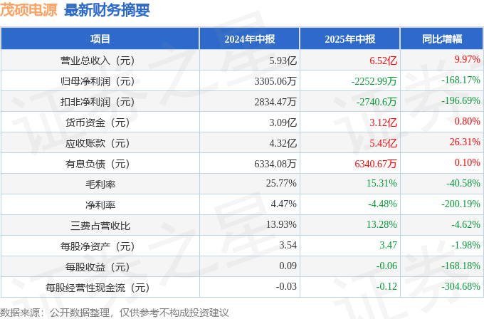 据证券之星公开数据整理,近期茂硕电源(002660)发布2025年中报。截至本报告期末,公司营业总收入6.52亿元,同比上升9.97%,归母净利润-2252.99万元,同比下降168.17%。按单季度数据看,第二季度营业总收入3.51亿元,同比上升6.21%,第二季度归母净利润-2312.78万元,同比下降209.63%。本报告期茂硕电源公司应收账款体量较大,当期应收账款占最新年报归母净利润比达807.85%。
