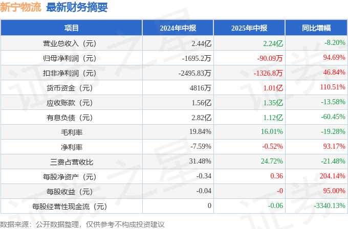 据证券之星公开数据整理,近期新宁物流(300013)发布2025年中报。截至本报告期末,公司营业总收入2.24亿元,同比下降8.2%,归母净利润-90.09万元,同比上升94.69%。按单季度数据看,第二季度营业总收入1.13亿元,同比下降8.33%,第二季度归母净利润-669.51万元,同比上升55.4%。本报告期新宁物流短期债务压力上升,流动比率达0.9。