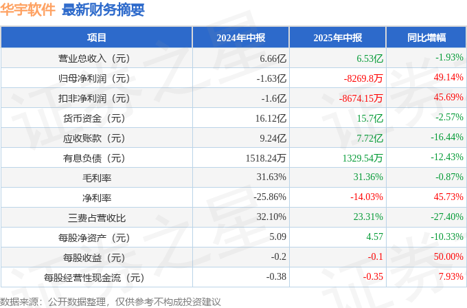 据证券之星公开数据整理,近期华宇软件(300271)发布2025年中报。截至本报告期末,公司营业总收入6.53亿元,同比下降1.93%,归母净利润-8269.8万元,同比上升49.14%。按单季度数据看,第二季度营业总收入3.82亿元,同比下降9.69%,第二季度归母净利润-3729.2万元,同比上升50.68%。本报告期华宇软件公司应收账款体量较大,当期应收账款占最新年报营业总收入比达47.38%。