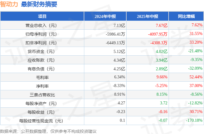据证券之星公开数据整理,近期智动力(300686)发布2025年中报。截至本报告期末,公司营业总收入7.67亿元,同比上升7.62%,归母净利润-4097.95万元,同比上升31.55%。按单季度数据看,第二季度营业总收入4.19亿元,同比上升7.43%,第二季度归母净利润-1715.67万元,同比上升28.52%。本报告期智动力盈利能力上升,毛利率同比增幅52.44%,净利率同比增幅37%。