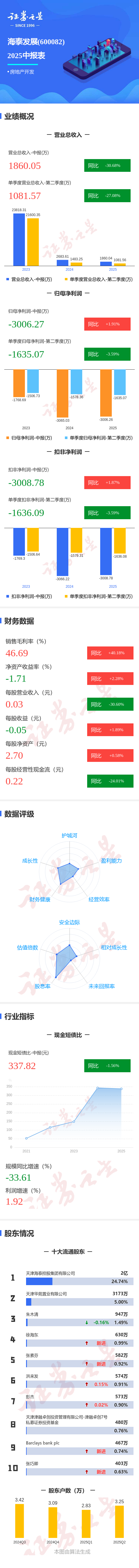 证券之星消息,海泰发展2025年中报显示,公司主营收入1860.05万元,同比下降30.69%;归母净利润-3006.27万元,同比上升1.92%;扣非净利润-3008.78万元,同比上升1.87%;其中2025年第二季度,公司单季度主营收入1081.57万元,同比下降27.08%;单季度归母净利润-1635.07万元,同比下降3.59%;单季度扣非净利润-1636.09万元,同比下降3.59%;负债率38.19%,投资收益47.95万元,财务费用2400.87万元,毛利率46.69%。