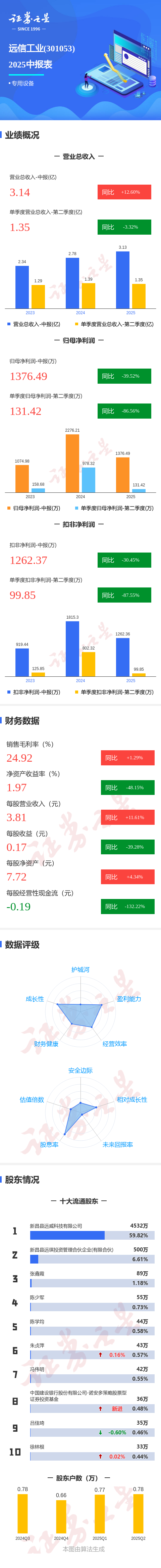 证券之星消息,远信工业2025年中报显示,公司主营收入3.14亿元,同比上升12.61%;归母净利润1376.49万元,同比下降39.53%;扣非净利润1262.37万元,同比下降30.46%;其中2025年第二季度,公司单季度主营收入1.35亿元,同比下降3.32%;单季度归母净利润131.42万元,同比下降86.57%;单季度扣非净利润99.85万元,同比下降87.55%;负债率47.36%,财务费用947.3万元,毛利率24.92%。
