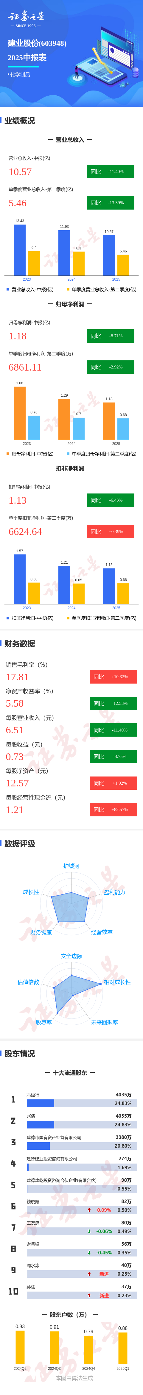 证券之星消息,建业股份2025年中报显示,公司主营收入10.57亿元,同比下降11.41%;归母净利润1.18亿元,同比下降8.72%;扣非净利润1.13亿元,同比下降6.43%;其中2025年第二季度,公司单季度主营收入5.46亿元,同比下降13.39%;单季度归母净利润6861.11万元,同比下降2.92%;单季度扣非净利润6624.64万元,同比上升0.39%;负债率18.47%,投资收益33.21万元,财务费用-204.53万元,毛利率17.81%。