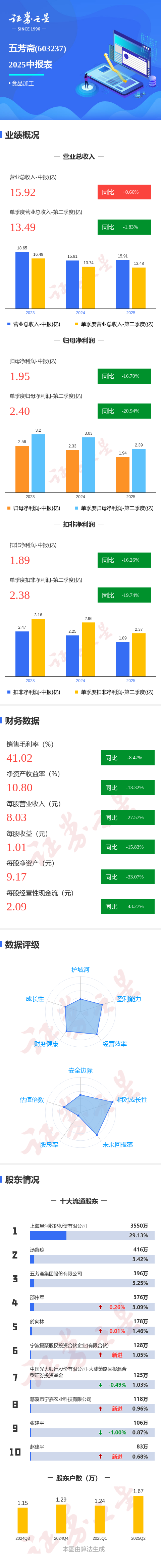 证券之星消息,五芳斋2025年中报显示,公司主营收入15.92亿元,同比上升0.66%;归母净利润1.95亿元,同比下降16.7%;扣非净利润1.89亿元,同比下降16.26%;其中2025年第二季度,公司单季度主营收入13.49亿元,同比下降1.84%;单季度归母净利润2.4亿元,同比下降20.95%;单季度扣非净利润2.38亿元,同比下降19.74%;负债率36.31%,投资收益91.96万元,财务费用189.52万元,毛利率41.02%。