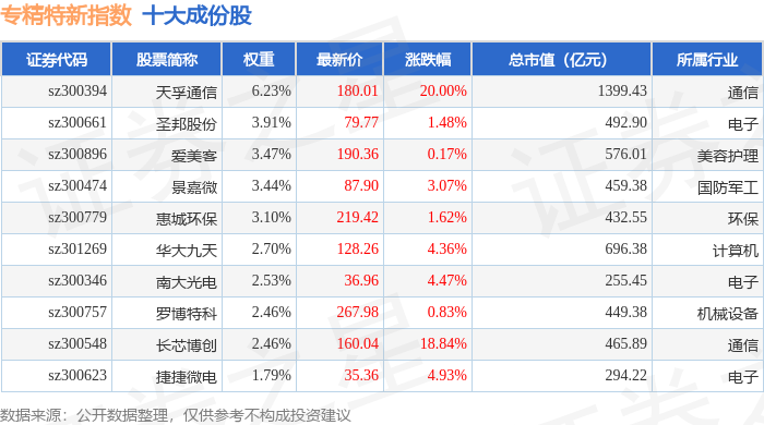 证券之星消息,8月28日,专精特新(399267)指数报收于2246.17点,涨4.26%,成交960.15亿元,换手率7.77%。当日该指数成份股中,上涨的有77家,天孚通信以20.0%的涨幅领涨,下跌的有23家,托普云农以7.67%的跌幅领跌。