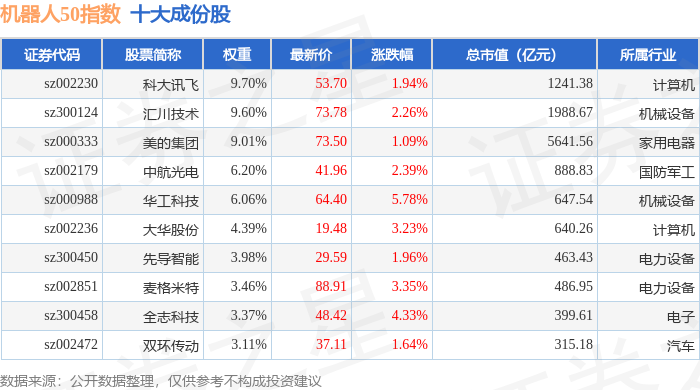 证券之星消息,8月28日,机器人50(399283)指数报收于4153.91点,涨1.9%,成交710.29亿元,换手率5.37%。当日该指数成份股中,上涨的有36家,星网宇达以9.99%的涨幅领涨,下跌的有14家,科大智能以4.48%的跌幅领跌。