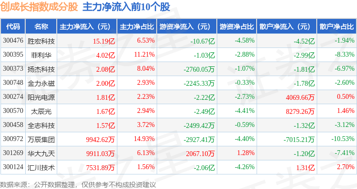 资金流向方面,创成长(399296)指数成份股当日主力资金净流出合计34.38亿元,游资资金净流出合计11.53亿元,散户资金净流入合计45.92亿元。成份股资金流向详情见下表: