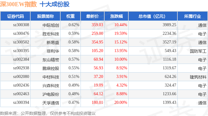 证券之星消息,8月28日,深300EW(399633)指数报收于5841.68点,涨2.01%,成交6151.8亿元,换手率2.58%。当日该指数成份股中,上涨的有210家,天孚通信以20.0%的涨幅领涨,下跌的有83家,中航成飞以4.81%的跌幅领跌。