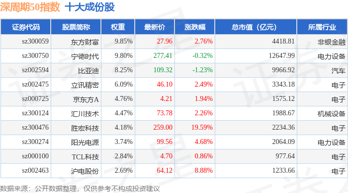证券之星消息,8月28日,深周期50(399670)指数报收于3818.31点,涨2.73%,成交1517.61亿元,换手率2.27%。当日该指数成份股中,上涨的有40家,胜宏科技以19.59%的涨幅领涨,下跌的有9家,比亚迪以1.23%的跌幅领跌。