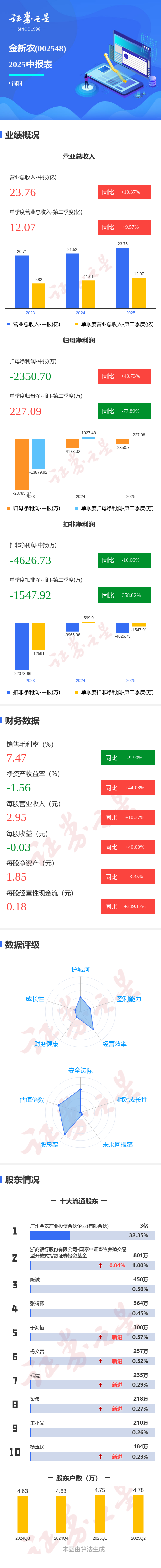 证券之星消息,金新农2025年中报显示,公司主营收入23.76亿元,同比上升10.38%;归母净利润-2350.7万元,同比上升43.74%;扣非净利润-4626.73万元,同比下降16.66%;其中2025年第二季度,公司单季度主营收入12.07亿元,同比上升9.58%;单季度归母净利润227.09万元,同比下降77.9%;单季度扣非净利润-1547.92万元,同比下降358.03%;负债率72.08%,投资收益15.09万元,财务费用7138.1万元,毛利率7.47%。