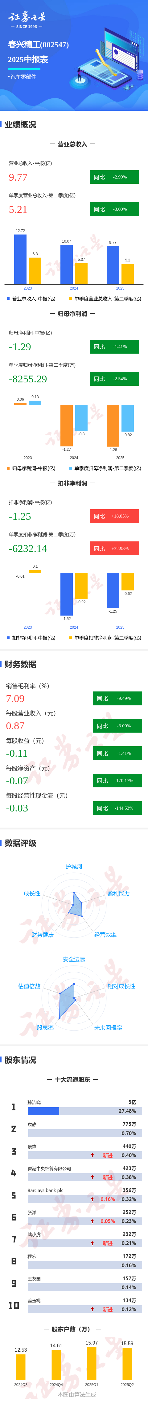 证券之星消息,春兴精工2025年中报显示,公司主营收入9.77亿元,同比下降3.0%;归母净利润-1.29亿元,同比下降1.42%;扣非净利润-1.25亿元,同比上升18.05%;其中2025年第二季度,公司单季度主营收入5.21亿元,同比下降3.0%;单季度归母净利润-8255.29万元,同比下降2.54%;单季度扣非净利润-6232.14万元,同比上升32.99%;负债率101.36%,投资收益-92.93万元,财务费用3529.57万元,毛利率7.09%。