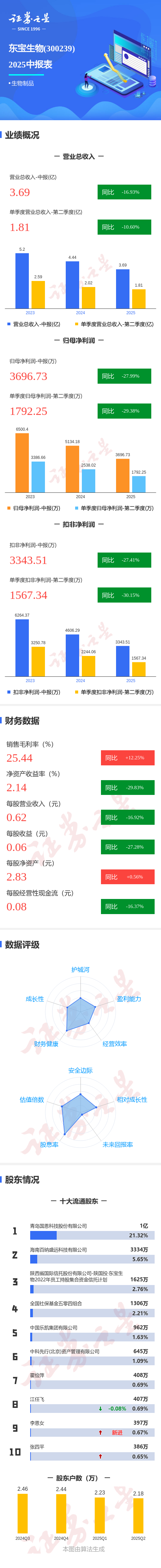 证券之星消息,东宝生物2025年中报显示,公司主营收入3.69亿元,同比下降16.93%;归母净利润3696.73万元,同比下降28.0%;扣非净利润3343.51万元,同比下降27.41%;其中2025年第二季度,公司单季度主营收入1.81亿元,同比下降10.61%;单季度归母净利润1792.25万元,同比下降29.38%;单季度扣非净利润1567.34万元,同比下降30.16%;负债率33.79%,投资收益-156.6万元,财务费用83.43万元,毛利率25.44%。