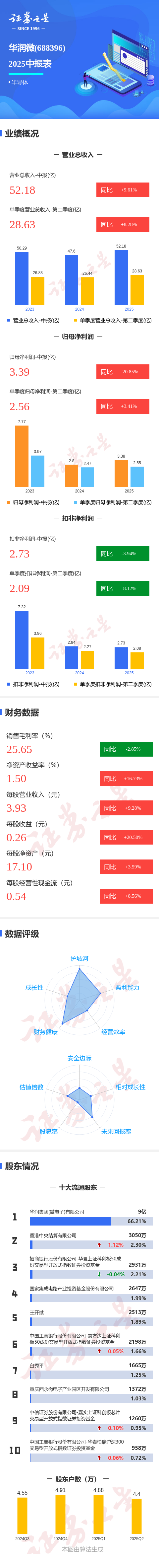证券之星消息,华润微2025年中报显示,公司主营收入52.18亿元,同比上升9.62%;归母净利润3.39亿元,同比上升20.85%;扣非净利润2.73亿元,同比下降3.95%;其中2025年第二季度,公司单季度主营收入28.63亿元,同比上升8.28%;单季度归母净利润2.56亿元,同比上升3.42%;单季度扣非净利润2.09亿元,同比下降8.13%;负债率16.58%,投资收益-2.32亿元,财务费用-9894.58万元,毛利率25.65%。