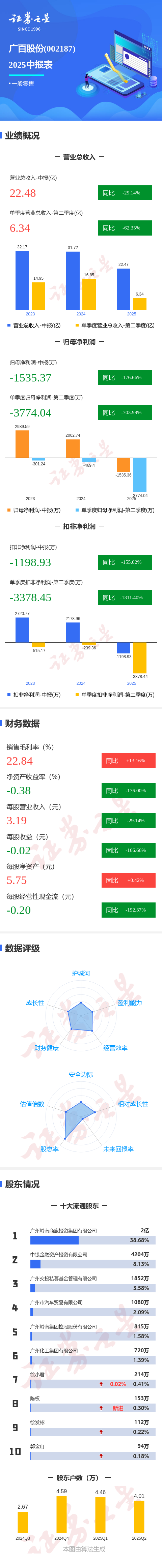 证券之星消息,广百股份2025年中报显示,公司主营收入22.48亿元,同比下降29.15%;归母净利润-1535.37万元,同比下降176.66%;扣非净利润-1198.93万元,同比下降155.02%;其中2025年第二季度,公司单季度主营收入6.34亿元,同比下降62.36%;单季度归母净利润-3774.04万元,同比下降704.0%;单季度扣非净利润-3378.45万元,同比下降1311.41%;负债率43.5%,投资收益-335.78万元,财务费用1416.76万元,毛利率22.84%。