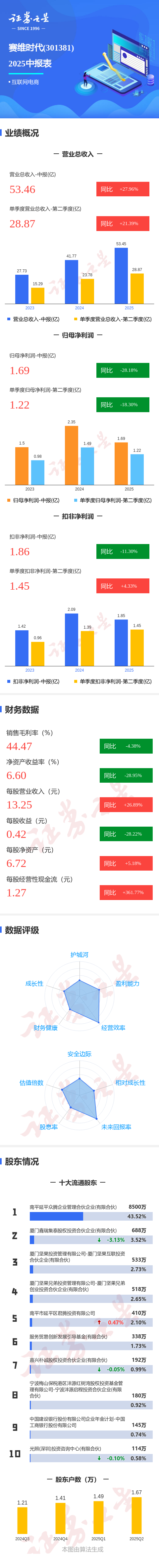证券之星消息,赛维时代2025年中报显示,公司主营收入53.46亿元,同比上升27.96%;归母净利润1.69亿元,同比下降28.18%;扣非净利润1.86亿元,同比下降11.3%;其中2025年第二季度,公司单季度主营收入28.87亿元,同比上升21.39%;单季度归母净利润1.22亿元,同比下降18.31%;单季度扣非净利润1.45亿元,同比上升4.34%;负债率42.82%,投资收益958.35万元,财务费用-2203.56万元,毛利率44.47%。