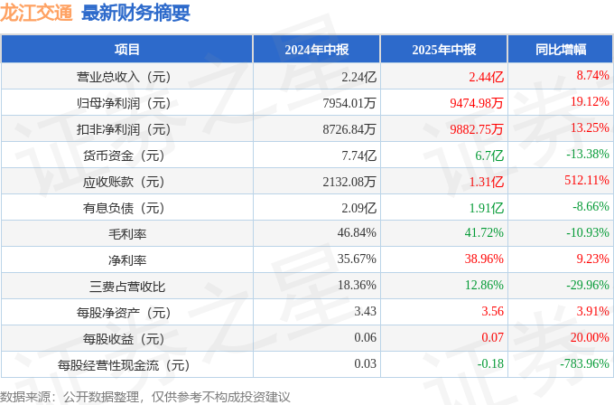 据证券之星公开数据整理,近期龙江交通(601188)发布2025年中报。截至本报告期末,公司营业总收入2.44亿元,同比上升8.74%,归母净利润9474.98万元,同比上升19.12%。按单季度数据看,第二季度营业总收入1.38亿元,同比上升24.13%,第二季度归母净利润3177.74万元,同比下降3.09%。本报告期龙江交通公司应收账款体量较大,当期应收账款占最新年报归母净利润比达85.64%。