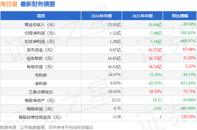 据证券之星公开数据整理,近期海目星(688559)发布2025年中报。截至本报告期末,公司营业总收入16.64亿元,同比下降30.5%,归母净利润-7.08亿元,同比下降565.65%。按单季度数据看,第二季度营业总收入11.26亿元,同比下降16.43%,第二季度归母净利润-5.2亿元,同比下降569.08%。本报告期海目星三费占比上升明显,财务费用、销售费用和管理费用总和占总营收同比增幅达47.32%。