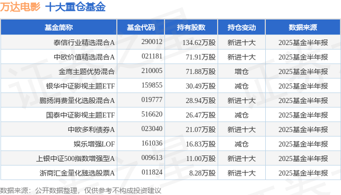 持有万达电影最多的基金为泰信行业精选混合A,目前规模为2.38亿元,最新净值1.799(8月27日),较上一交易日下跌3.38%,近一年上涨41.99%。该基金现任基金经理为王博强 陈颖。