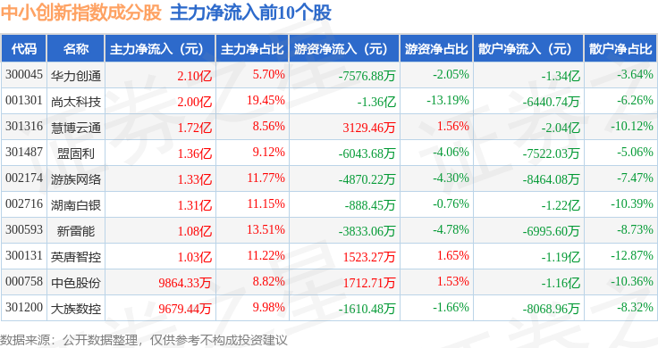 资金流向方面,中小创新(399015)指数成份股当日主力资金净流出合计130.8亿元,游资资金净流入合计32.35亿元,散户资金净流入合计98.45亿元。成份股资金流向详情见下表: