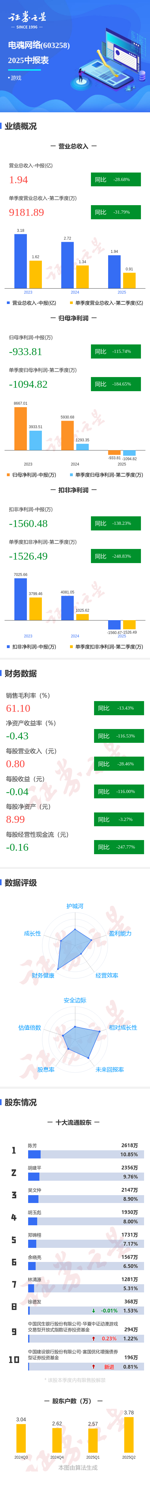 证券之星消息,电魂网络2025年中报显示,公司主营收入1.94亿元,同比下降28.69%;归母净利润-933.81万元,同比下降115.75%;扣非净利润-1560.48万元,同比下降138.24%;其中2025年第二季度,公司单季度主营收入9181.89万元,同比下降31.79%;单季度归母净利润-1094.82万元,同比下降184.65%;单季度扣非净利润-1526.49万元,同比下降248.83%;负债率12.29%,投资收益304.45万元,财务费用-1658.62万元,毛利率61.1%。