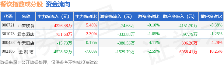 资金流向方面,餐饮指数(399238)成份股当日主力资金净流入合计413.69万元,游资资金净流出合计2318.88万元,散户资金净流入合计1905.19万元。成份股资金流向详情见下表: