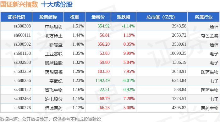国证新兴(399392)指数十大成份股详情如下: