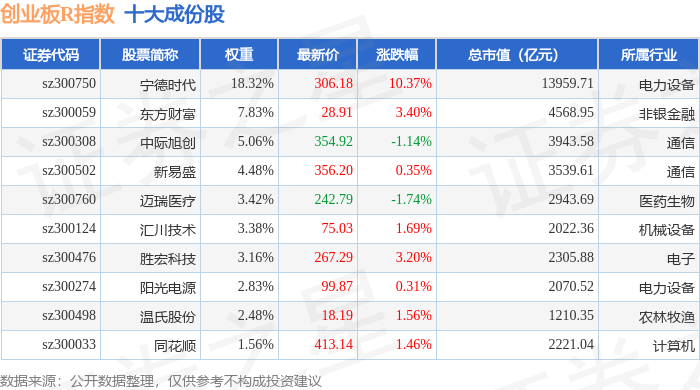 创业板R(399606)指数十大成份股详情如下: