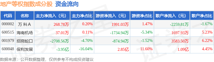 资金流向方面,地产等权(399983)指数成份股当日主力资金净流出合计4.19亿元,游资资金净流入合计2.79亿元,散户资金净流入合计1.4亿元。成份股资金流向详情见下表: