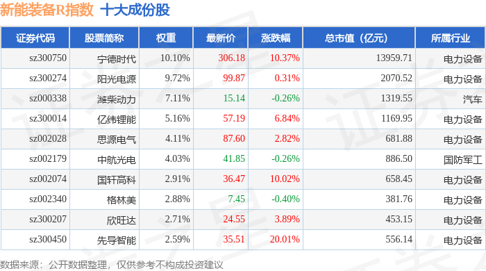 新能装备R(470043)指数十大成份股详情如下: