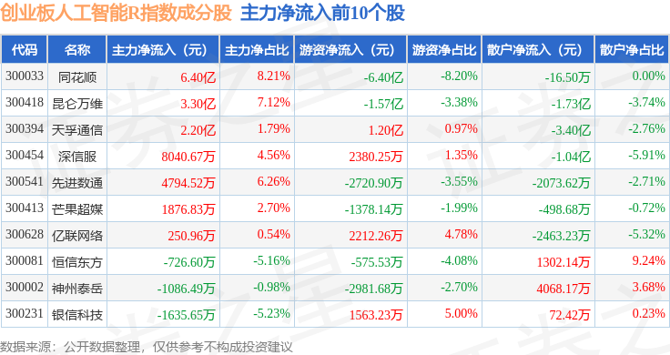 资金流向方面,创业板人工智能R(470070)指数成份股当日主力资金净流出合计68.03亿元,游资资金净流入合计12.31亿元,散户资金净流入合计55.72亿元。成份股资金流向详情见下表:
