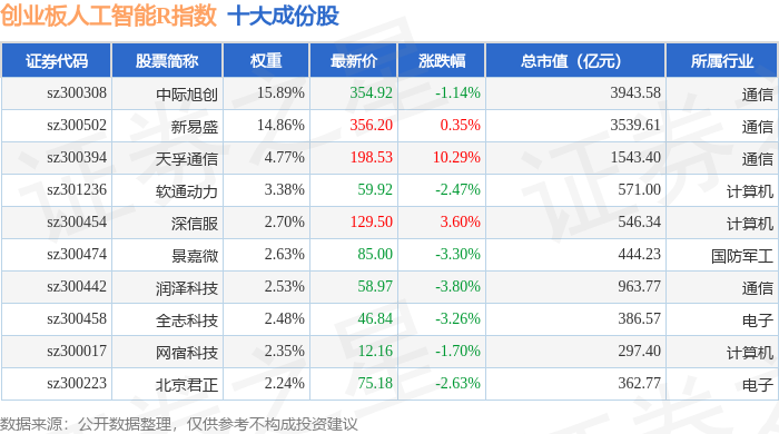 创业板人工智能R(470070)指数十大成份股详情如下: