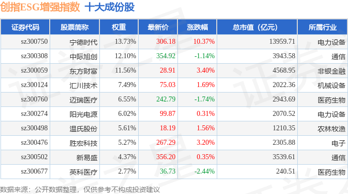 证券之星消息,8月29日,创指ESG增强(970034)指数报收于2586.96点,涨2.05%,成交1929.69亿元,换手率4.22%。当日该指数成份股中,上涨的有26家,宁德时代以10.37%的涨幅领涨,下跌的有14家,扬杰科技以3.1%的跌幅领跌。