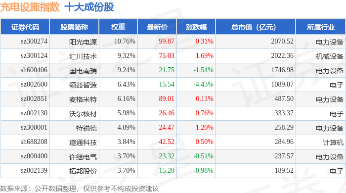 证券之星消息,8月29日,充电设施(980077)指数报收于3663.59点,跌0.44%,成交518.28亿元,换手率4.8%。当日该指数成份股中,上涨的有18家,科达自控以14.94%的涨幅领涨,下跌的有28家,科大智能以5.38%的跌幅领跌。