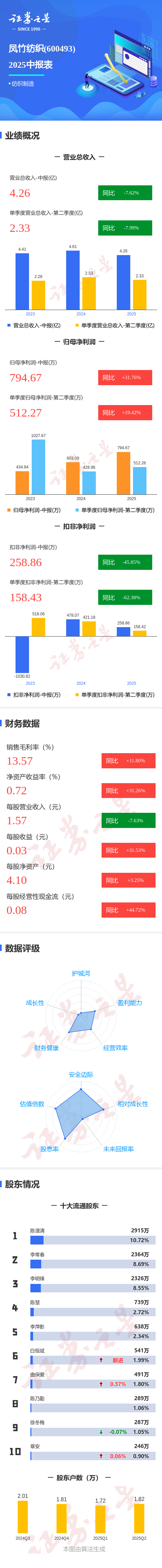 证券之星消息,凤竹纺织2025年中报显示,公司主营收入4.26亿元,同比下降7.63%;归母净利润794.67万元,同比上升31.77%;扣非净利润258.86万元,同比下降45.85%;其中2025年第二季度,公司单季度主营收入2.33亿元,同比下降7.99%;单季度归母净利润512.27万元,同比上升19.42%;单季度扣非净利润158.43万元,同比下降62.38%;负债率36.01%,投资收益457.4万元,财务费用-236.91万元,毛利率13.57%。