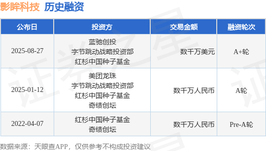 证券之星消息,根据天眼查APP于8月27日公布的信息整理,影眸科技(上海)有限公司A+轮融资,融资额数千万美元,参与投资的机构包括蓝驰创投,字节跳动战略投资部,红杉中国种子基金。